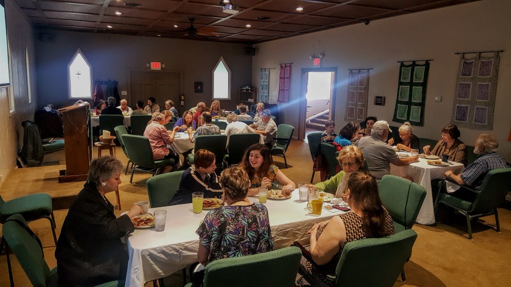 Our services are each Sunday from 11:15am to 12:15pm, followed by Conversations and Calories.